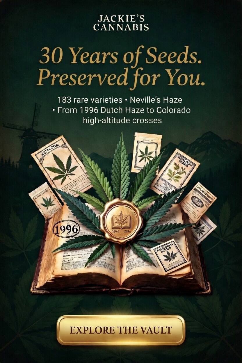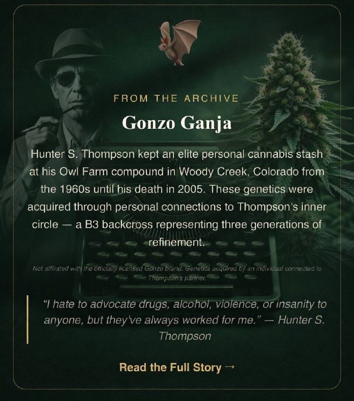 A 30-year journey spanning Dutch genetics, Caribbean landraces, rare African sativas, and modern American breeding. Including Hunter S. Thompson's personal strain.